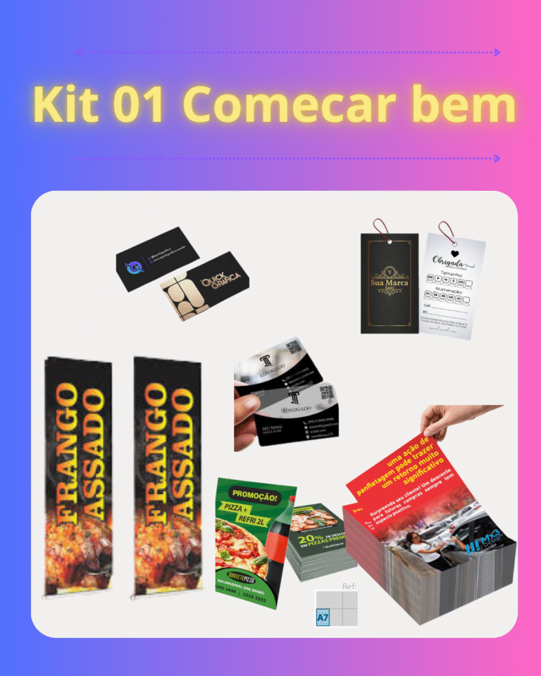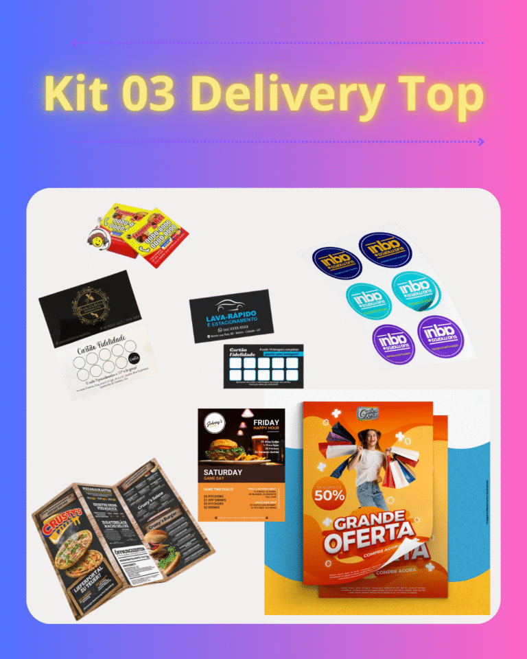 1.000 flyers com cardápio, 300 adesivos personalizados, 100 cartões fidelidade, 1 banner WhatsApp, 200 ímãs